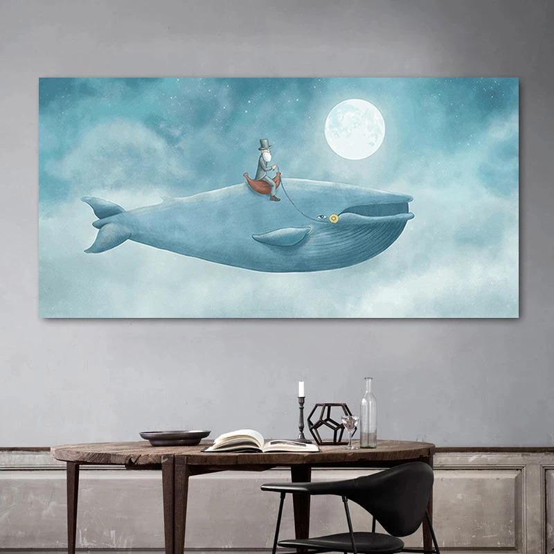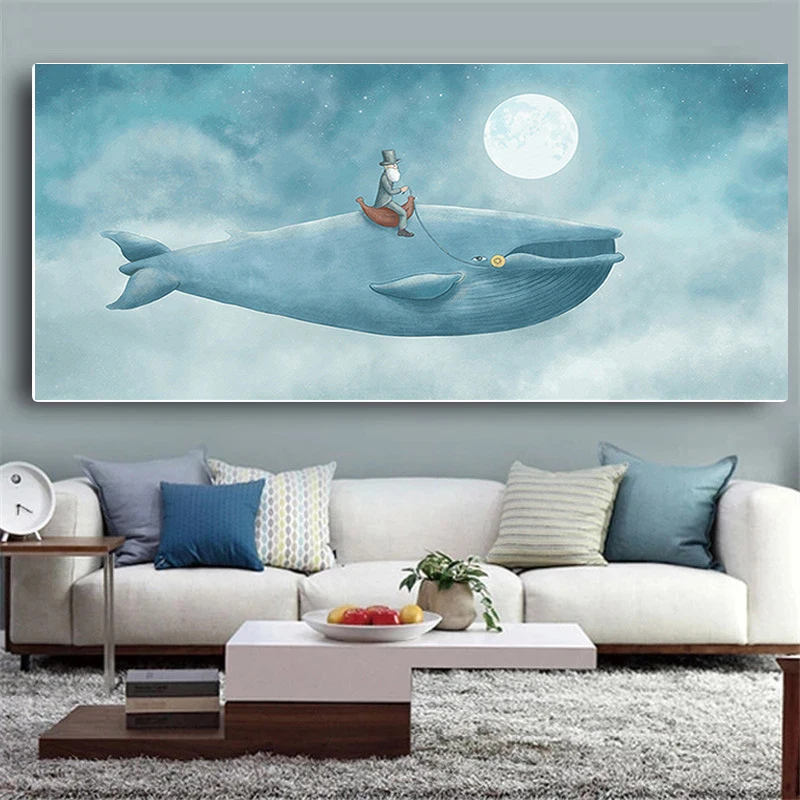 Blue Whale and Kid Anime Canvas Painting Modern Cartoon Seascape Posters and Prints Home Decor Cuadros Wall Picture for Kid Room