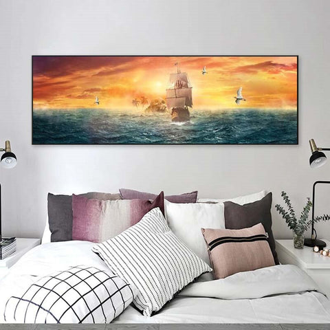 tableau peinture bateaux ciel orange