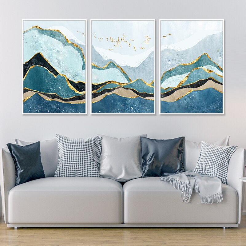 Si vous avez déjà une pièce marquante dans la pièce, vous pouvez envisager de la faire ressortir dans vos affiches murales, par exemple des touches de vert olive dans un tableau placé dans un salon avec un canapé vert olive.